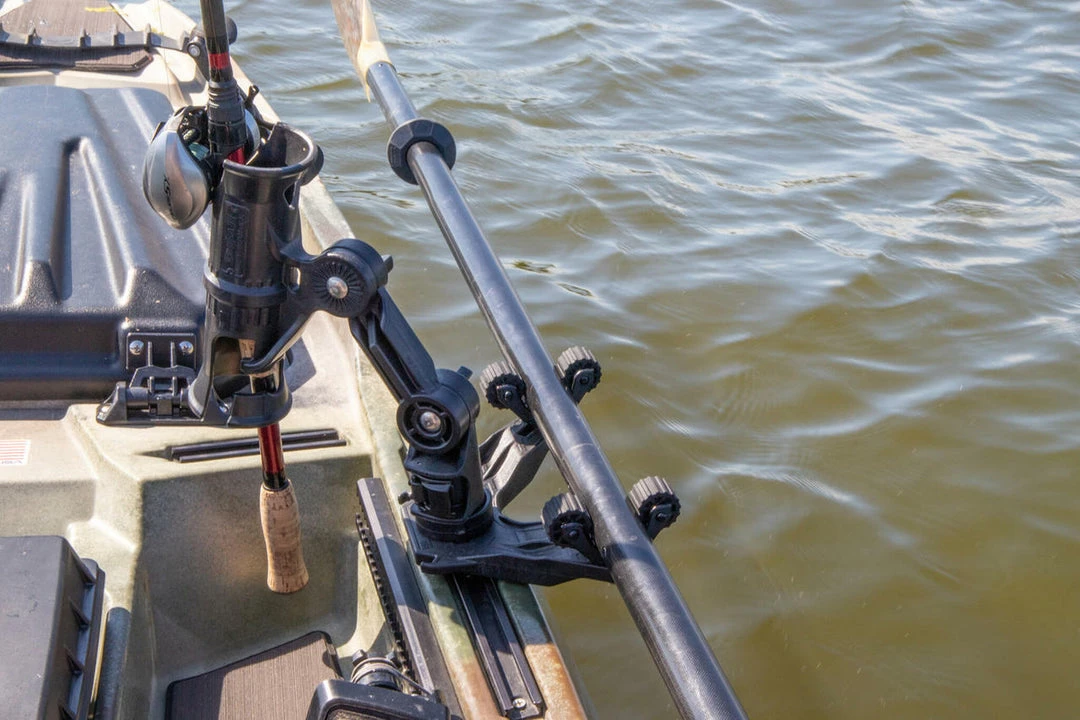 If you are tight on track space, the DoubleHeader includes an additional feature to add LockNLoad accessories like YakAttack rod holders, camera mounts, and more. Simply replace the stock knob and MightyBolt from the DoubleHeader with the LockNLoad base of a rod holder or other accessories, and you are able to have multiple attachments on a short section of track or a single point of attachment like a MightyMount II. The DoubleHeader track mount is compatible with YakAttack GearTrac, MightMount XL, MightyMount Switch, MightyMount II, and most other factory-installed kayak track.